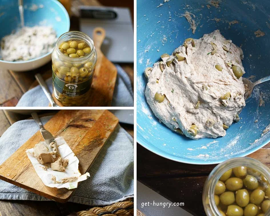 - Mehl ins Wasser sieben. Oliven, Salz, Rosmarin ebenfalls dazu.