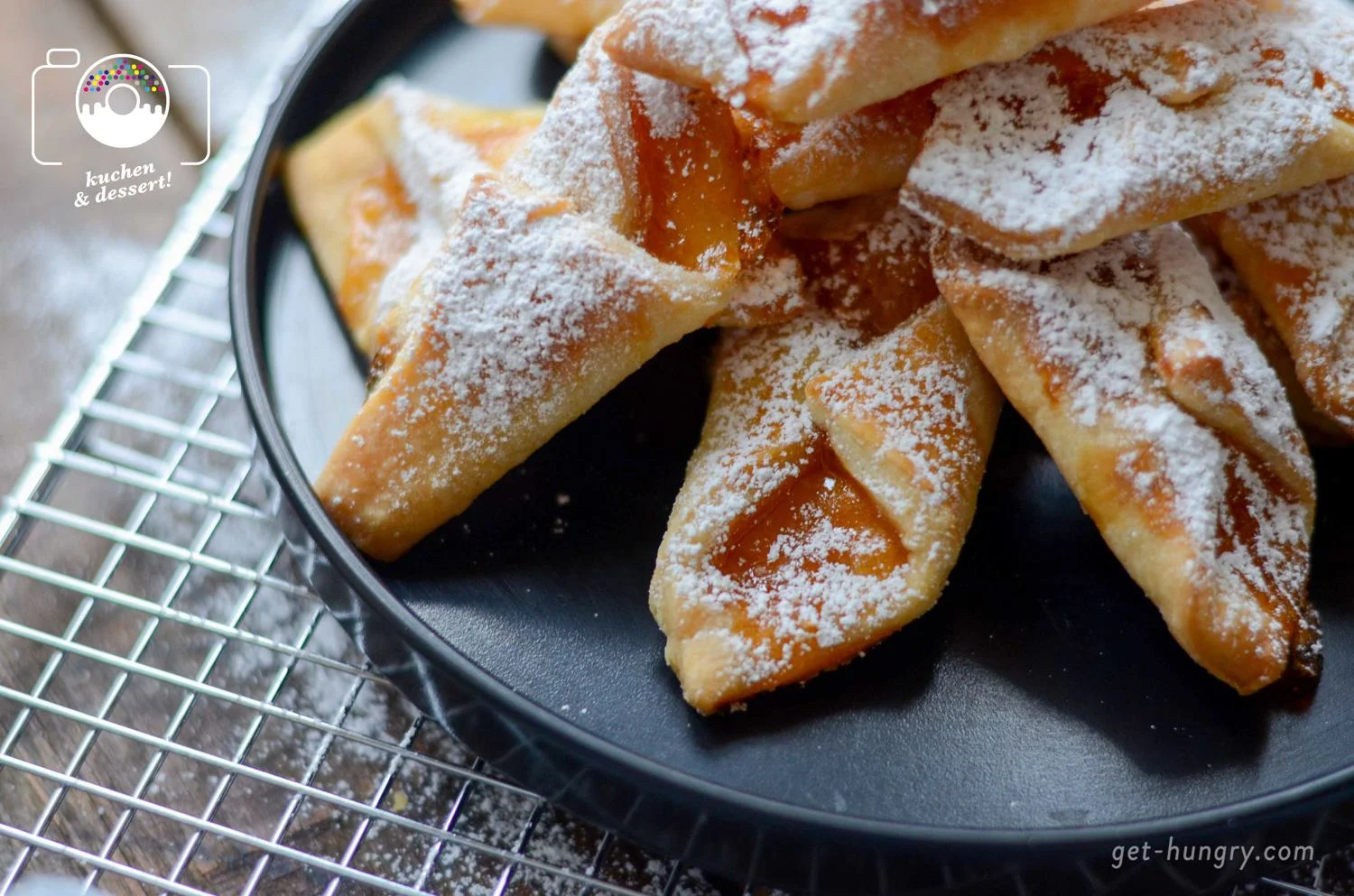 Übrigens: Würde man das Gebäck im Dreieck zuklappen heißt es "Polsterzipfel" aka "Hasenohren" und ist eine typisch österreichische Mehlspeise. Als so genannte Marmeladenstangerl habe ich sie übrigens auf Kochschürze.at entdeckt und zur Rolle umbenannt.