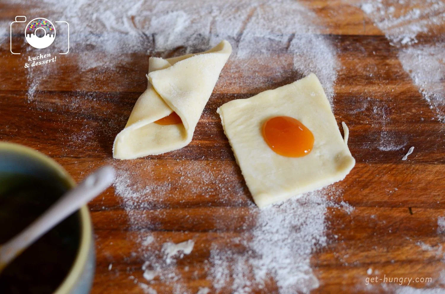 Tipp: Damit die Marmelade beim Backen nicht ausläuft, nur einen kleinen Klecks in die Mitte geben oder den Teig zu einer Art Schiffchen-Form an den Seiten leicht aufrollen.
