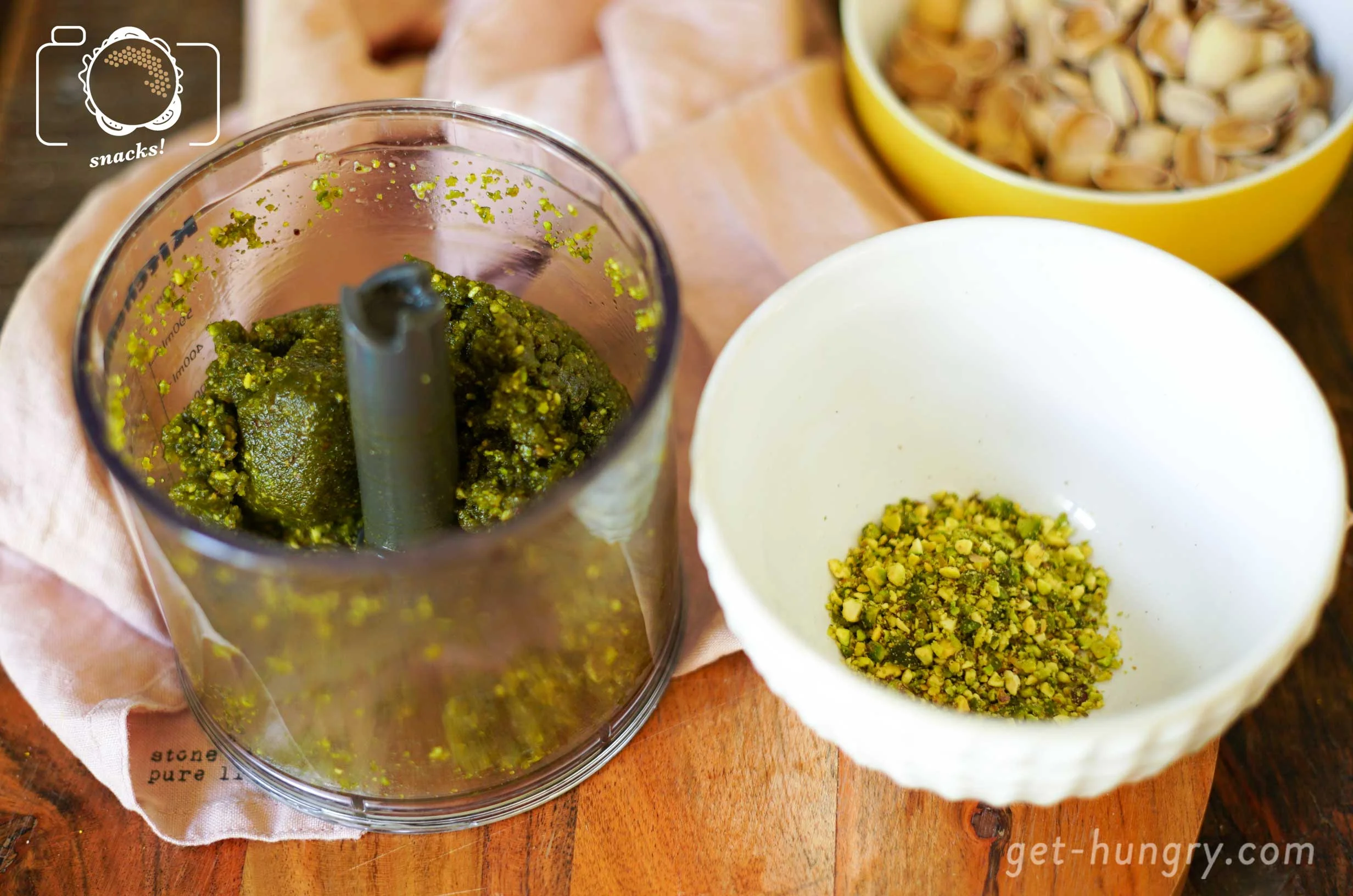 - Alle zusammen in einen Mixer/Küchenmaschine füllen und mehrere Minuten fein mahlen lassen, bis die Pistazien immer öliger werden.